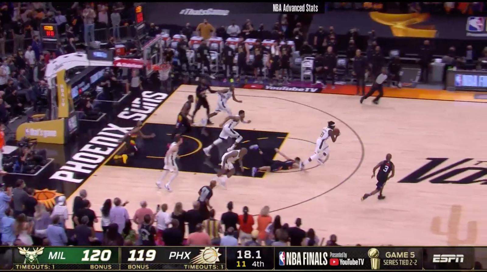 Consider, for instance, this screenshot of the most important play of Game 5. At the moment Jrue Holiday collects the loose ball he forced by stripping Booker, the Suns have one player back, one player sprawled on the floor, and three players hugging the baseline, behind every single Buck racing the other way. There’s a reason Giannis was open for his momentous alley-oop.