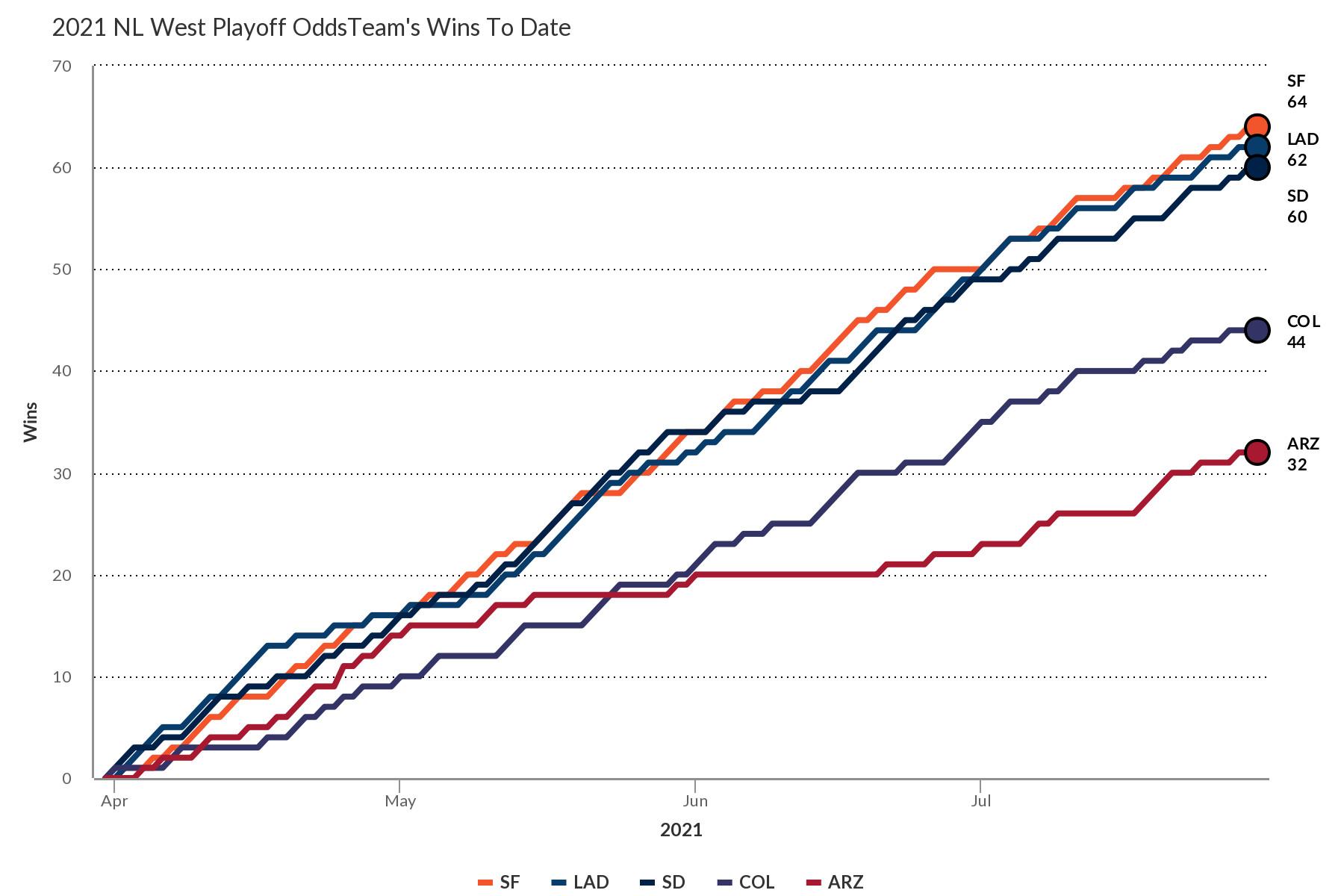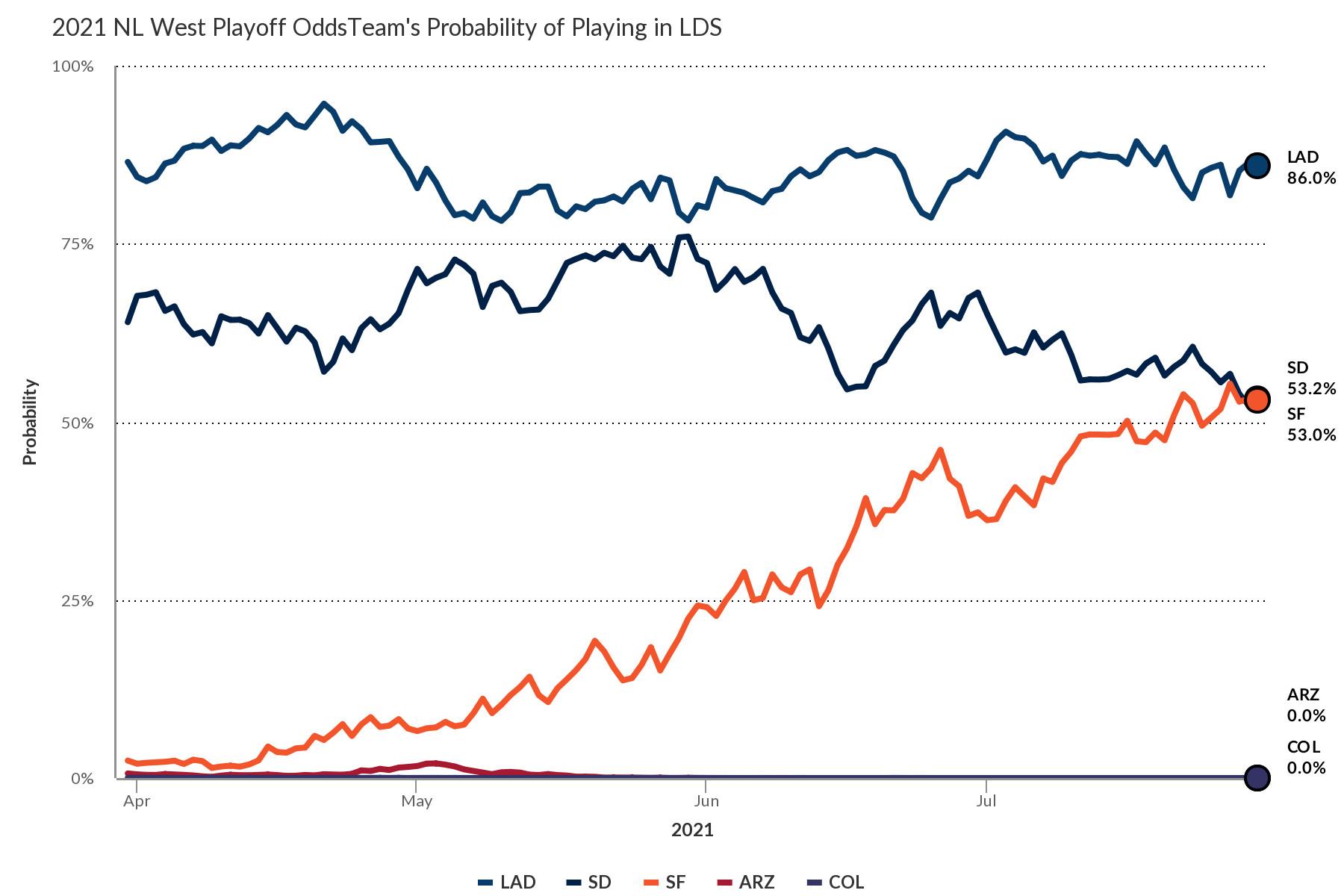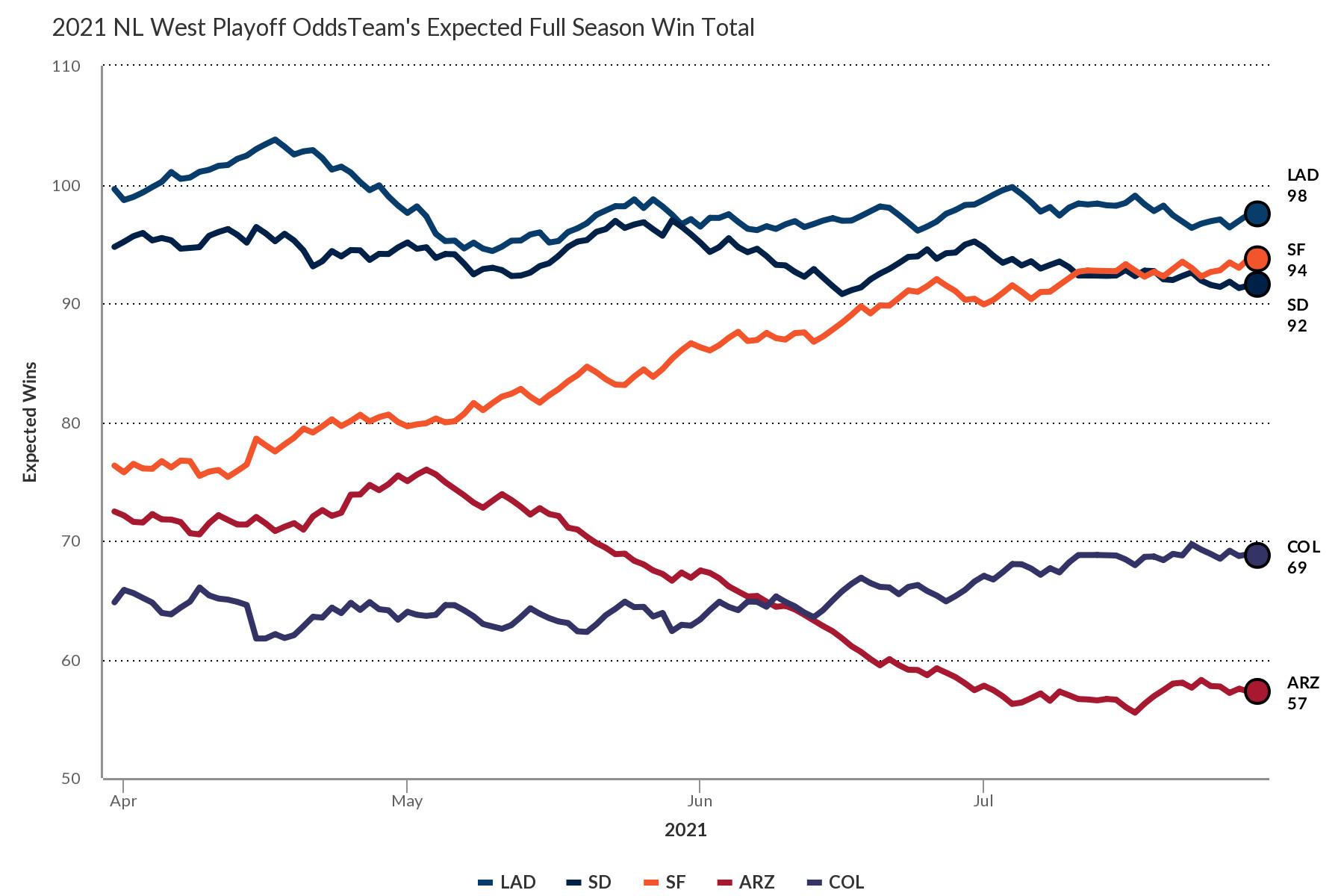 WAR totals alone can’t quite capture the full impact of the Turner-Scherzer trade. Although the first-place Giants, second-place Dodgers, and third-place Padres are all nearly locks to qualify for the playoffs, the division title—and the privilege of skipping the wild-card contest and advancing directly to the division series—are still up for grabs. Entering Friday, only 5.5 games separated the Giants and Padres, with the Dodgers (who lost to San Francisco on Thursday) three games out of first. When the Dodgers made their Thursday deals, they were two games out, and FanGraphs’ playoff odds (which still see the Giants as overachievers) pegged them as clear division favorites. But that outcome was (and is) far from certain, and it would have been much more in doubt if the Dodgers had missed out on the D.C. sweepstakes as the Padres or Giants helped themselves to one of the Nationals’ stars. By swap-blocking their direct competitors—or at least forcing them to look elsewhere for upgrades—the Dodgers also potentially saved themselves the strain of facing Scherzer in their last series against San Francisco or their three series still to come against San Diego.