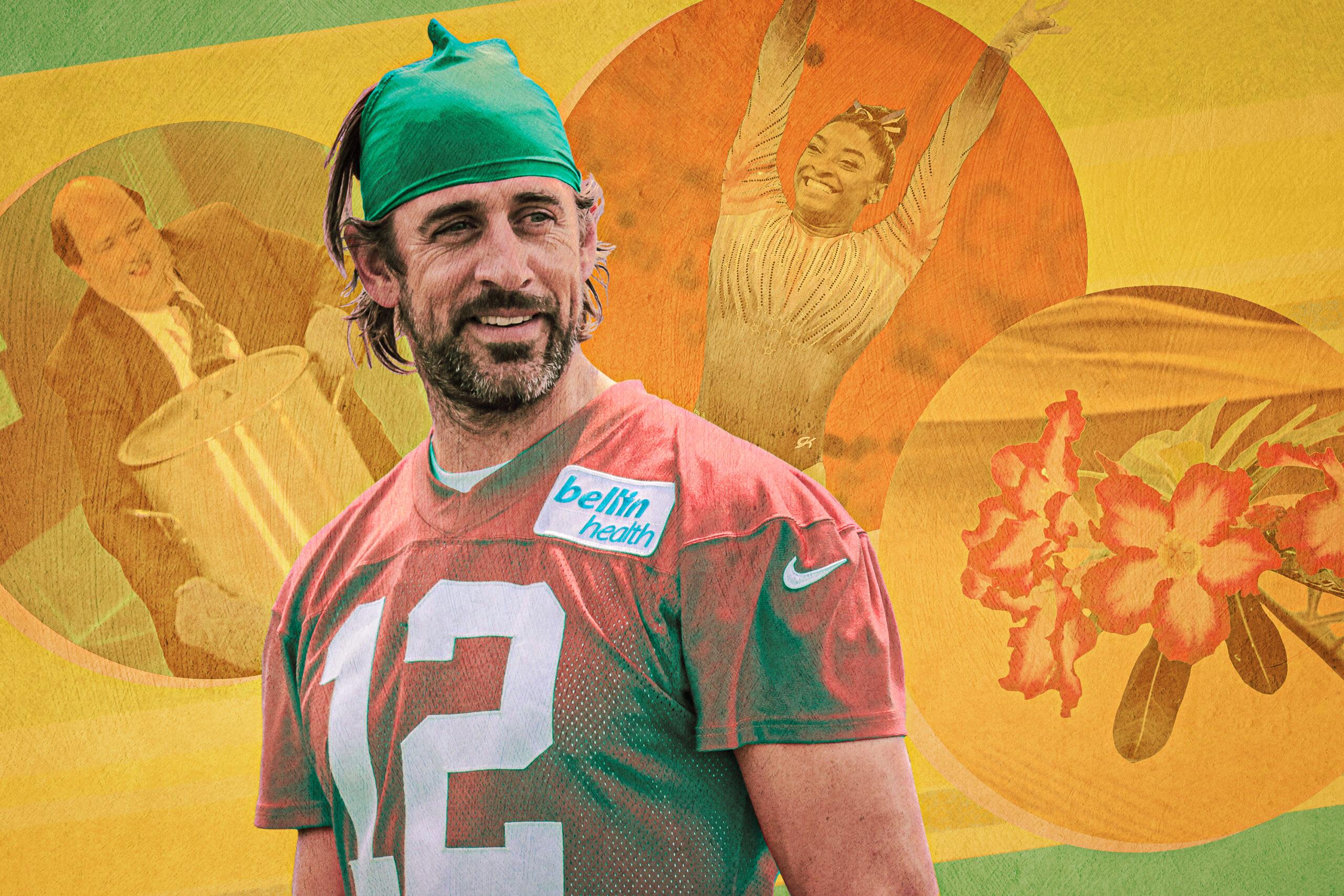 Aaron Rodgers and I were talking about The Office, because of course we were. He went viral last week after showing up to training camp in a shirt featuring an NBA Jam–style graphic of Kevin Malone and chili. Everything Rodgers did that week was seen as some sort of hieroglyphics to be deciphered, given his uncertain relationship and future with the Packers. The shirt was, it turns out, the first one he saw in his bedroom when he arrived after a late flight from California. He said he was jet-lagged and had one thought about wearing the shirt: “This is going to be awesome.” And he was glad there were photos. The sunglasses were from his old teammate AJ Hawk. “They’re like a throwback to ‘Macho Man’ Randy Savage.”