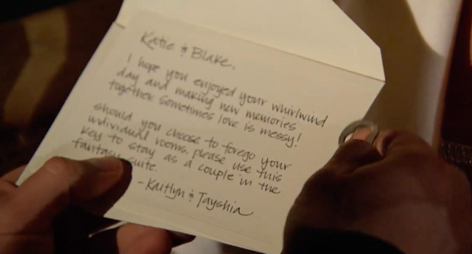 For years, I would make fun of the fact that the notes used to invite couples to spend the night together for the fantasy suite dates were clearly written by a host of different people—in spite of the fact that they were all supposed to be from Chris Harrison. But now that Harrison is gone, I must note: The note we saw in the finale, supposedly from Tayshia and Kaitlyn, has the same handwriting as a note from a previous season written by “Harrison”: