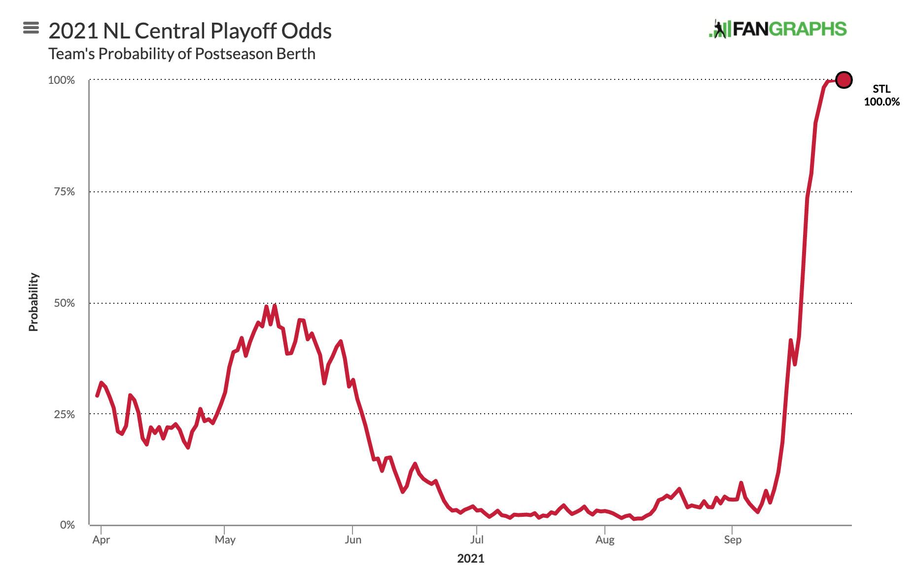 Now St. Louis can rest its relievers and set up Wainwright for a wild-card start without worrying about a fight for the final spot this weekend. The Cardinals won’t be favored in that game, on the road against either the Dodgers or Giants, but anything can happen in the tiny sample of one game of baseball, and St. Louis—with only home games remaining in the regular season—will enter that contest without a road loss in more than a month.