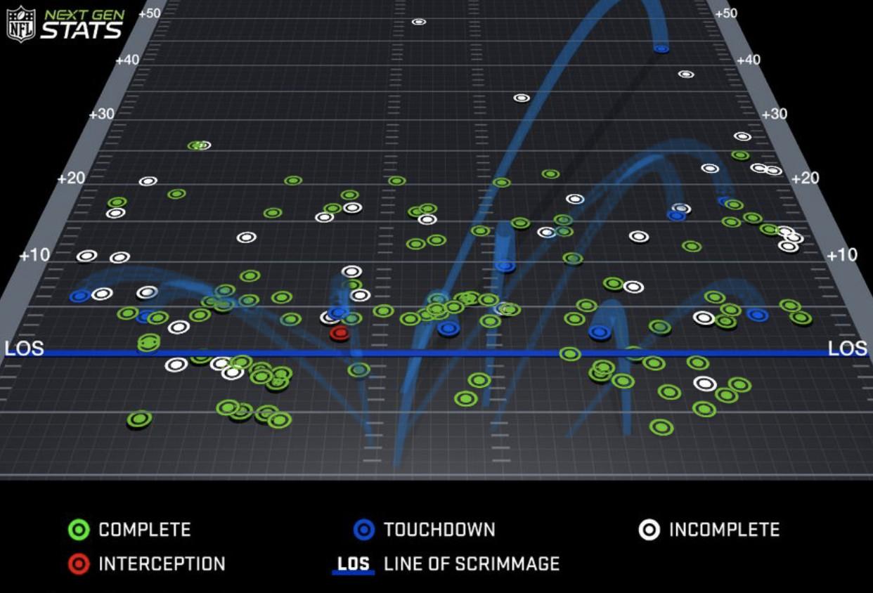 That’s a lot of green in the middle. Brady came into the week leading the league in completions inside the numbers, and he’s been far more efficient when targeting that area compared to the perimeter.