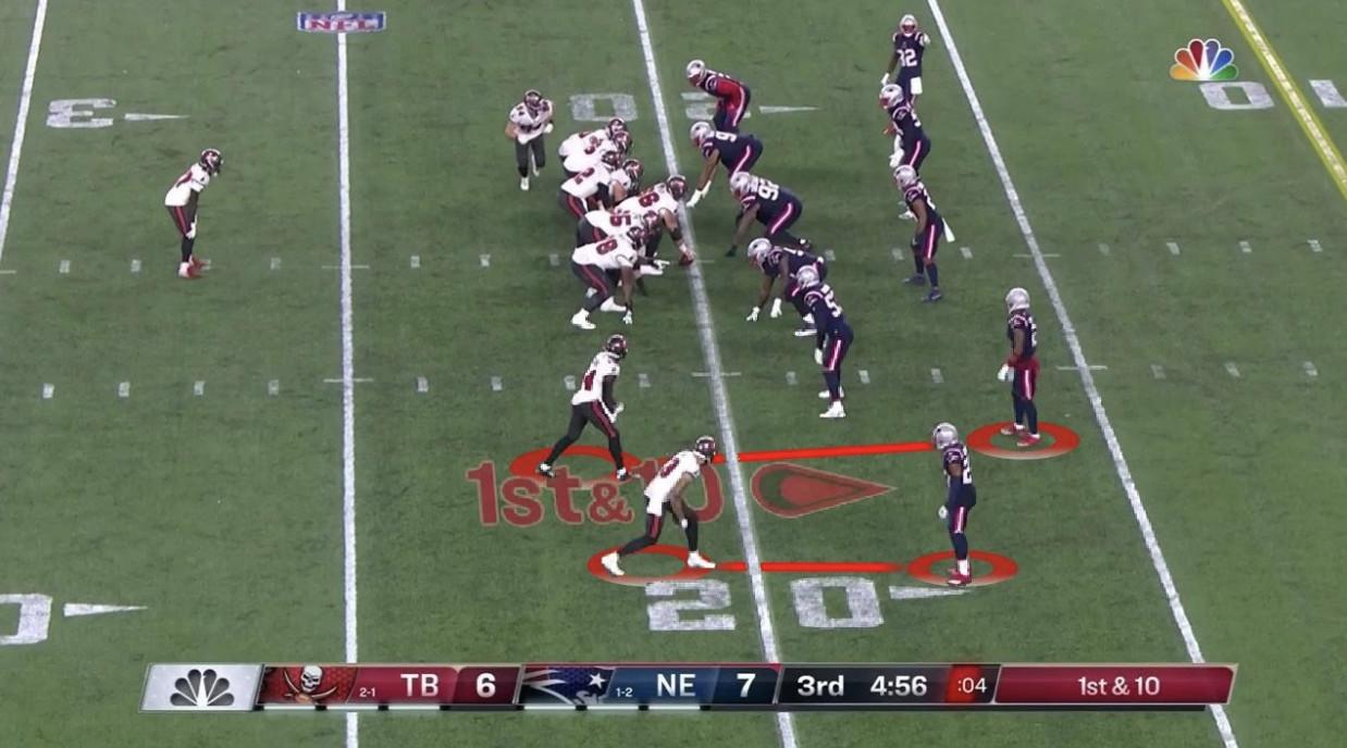 Belichick kept his matchups consistent throughout, with J.C. Jackson—who has replaced the injured Stephon Gilmore as the Pats’ no. 1 corner—on Evans, Mills countering Godwin, and Jonathan Jones going up against Brown. With Devin McCourty confined to the deep middle, the other safeties were responsible for Tampa Bay’s tight ends.