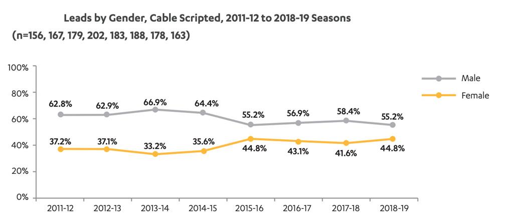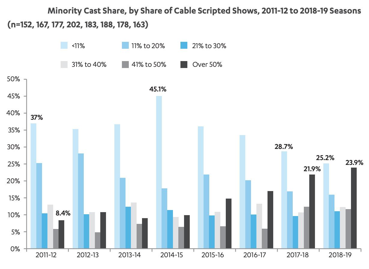 The authors of the Hollywood Diversity Report have documented the demographics of TV casts from the 2011-12 through the 2018-19 seasons. (The ninth installment, on the 2019-20 season, is due out later this month.) Their data analyzed the top eight credited actors in a show to determine a “minority cast share.” Series with a minority cast share of less than 11 percent have consistently represented a plurality of scripted cable shows, albeit to a dramatically decreasing degree of late.