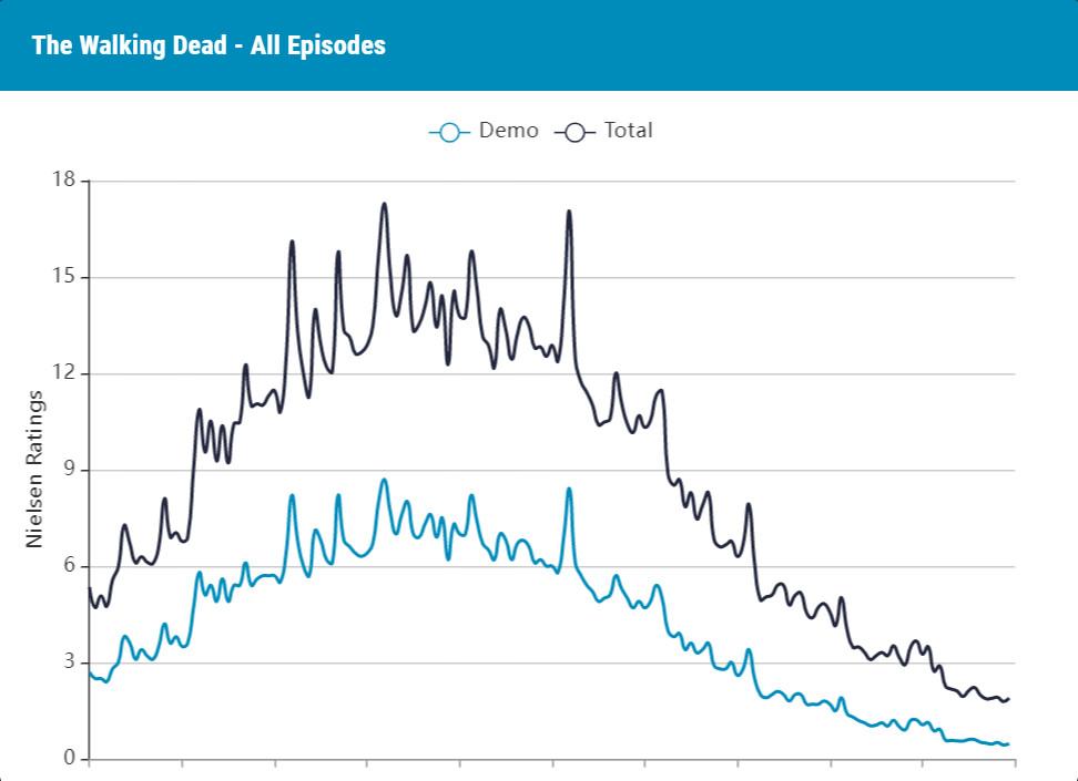 Few audiences were wider than The Walking Dead’s at the peak of its pre-cord-cutting popularity. The series averaged more than 10 million weekly viewers from seasons 3 through 7, peaking at more than 14 million in Season 5. Its linear ratings have since sunk precipitously, though that decline reflects changing viewing habits as much as the audience’s flagging interest level.