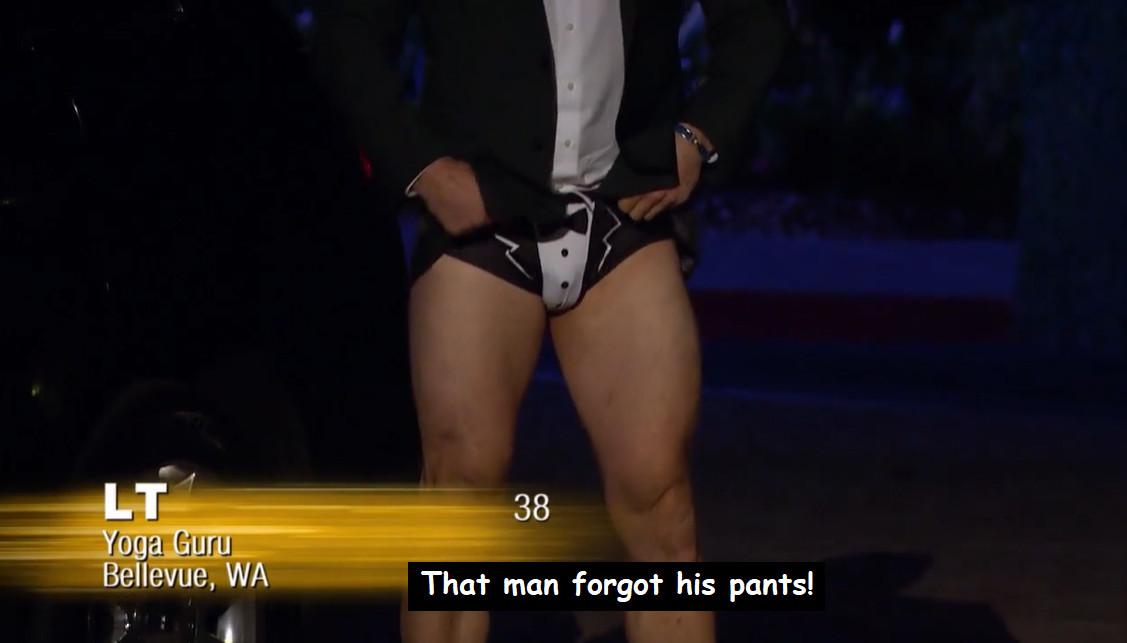 L.T., a yoga guru, arrives with his junk just absolutely everywhere. That is not what “Black Tie Optional” means, babe!