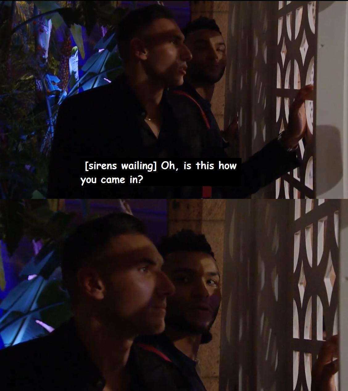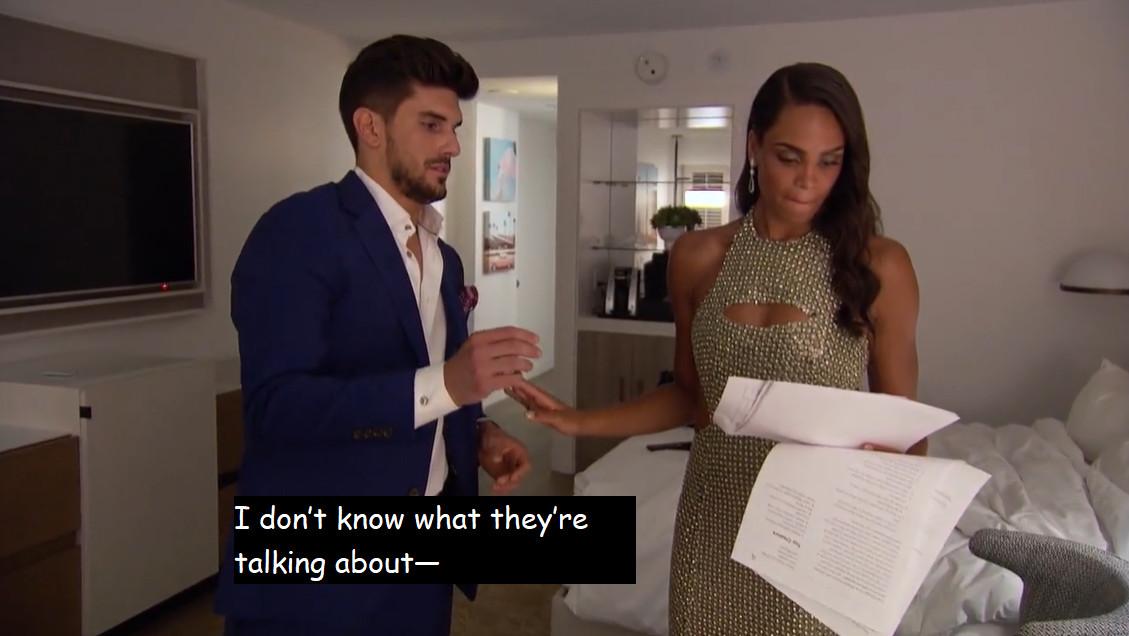 What is this, The Blacklist?! The seriousness with which Tayshia and Kaitlyn deliver the news about the document is too much to bear, but the levelheadedness with which Michelle receives it is pretty impressive. She does not like hearing that Ryan’s notes on teachers included the instruction, “So make it seem like you’re super interested in that stuff.” So Michelle glides over to Ryan, tells him they’re going to his room, glides up her One True Love, the Renaissance Esmeralda Resort & Spa staircase, and begins her own rifling through Ryan’s personal belongings anew.