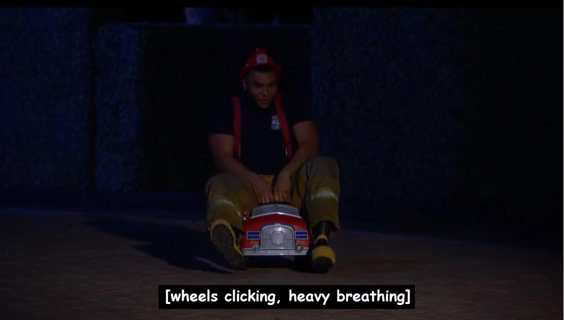 It’s cute; he’s legitimately panting after scooting all the way across the driveway to Michelle, and following their introduction, Daniel is so proud of himself for making an impression on Michelle as the only firefighter in the bunch with his little fire truck gimmick when all of the sudden …