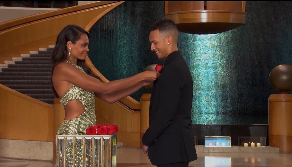 Men are simply going to men, I guess. But Joe came on Michelle’s season of The Bachelorette, he says, to explain that it’s a little deeper than that. Joe tells Michelle that, at the time they were messaging, there were shootings going on in George Floyd Square, where one of his real estate properties is, and it was affecting him emotionally. Michelle says, if anyone, she would have understood that as a woman of color whose students were also living in the same area. She wishes Joe could have communicated with her better at the time, to which Joe says he’s actually been going to therapy to work on that very thing. And even though Michelle has doubts so heavy that she has to take to the stairs once more to collect her thoughts—she ultimately forks a rose right over to Joe.