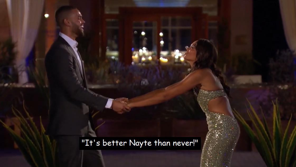 But probably not. Because there are moments when it seems like Brandon J., or Jamie, or maybe even RIIIIICK could get the first impression rose, but there are three things you need to know about Nayte: He’s 6-foot-8, he has two nose piercings that he is pulling off, and he managed to have an emotional breakthrough in his very first conversation with Michelle. When she asks him about himself, he says he’ll save the family stuff for later, because he heard her say how close-knit her family is, and that’s not exactly his situation. Michelle tells him, no, those are the things she wants to know about him, and he then tells her about the lack of familial intimacy he grew up with, and how he wants to break that cycle for his future family. It’s really sweet, and Nayte is straight-up in love with Michelle after she makes him feel so comfortable. As for Michelle—well, I mentioned Nayte was 6-foot-8, right?