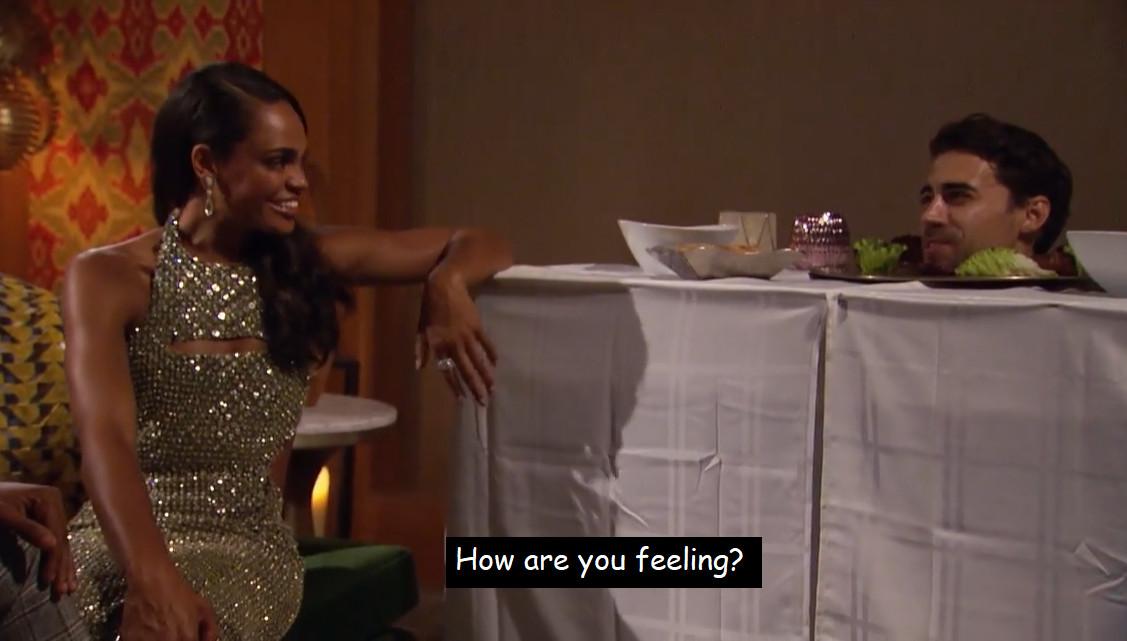 Everything about it is disconcerting, the least of which is Rick’s extended “I want to tell you about the special tonight” bit, which is extremely hard to focus on given the fact that it’s coming from a disembodied head. But Michelle does laugh a lot at Rick’s antics, and everytime she sees him and his table—which he wears through almost the entire cocktail party— she shouts his name like Amy Poehler in that stepdad skit with Horatio Sanz: “RIIIIICK!” Given James-in-the-Box’s run on Katie’s season and Paradise, I don’t even know what to do with these full-body, immobilizing gimmicks anymore. The fact is: They work.