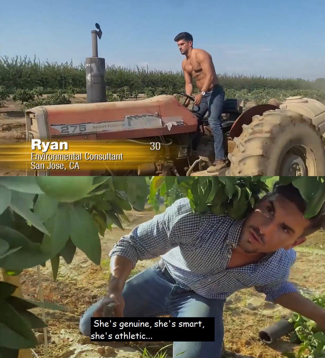 I probably could have told you that Ryan didn’t have the purest intentions when he rolled into this season shirtless in jeans on a tractor, and then put on his finest Banana Republic collared shirt to harvest the fields. I don’t know a lot about farming, but these don’t exactly seem like “genuine” clothing choices to me.