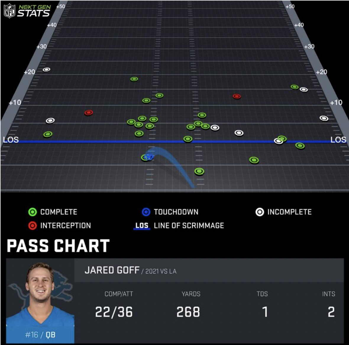 The Lions’ visit to SoFi Stadium served as Goff’s Inglewood homecoming and Detroit’s first meeting against Stafford. The matchup better highlighted the difference between the two passers and the reasons the Rams made the blockbuster trade nine months ago. Goff went 22-for-36 with 268 yards, one score, and two picks. His average depth of target was 4.3 yards; Stafford’s was 9.3. Goff completed 61 percent of his passes, 4.6 percentage points lower than expected; Stafford completed 68.3 percent of his attempts, 0.7 percentage points higher than expected.