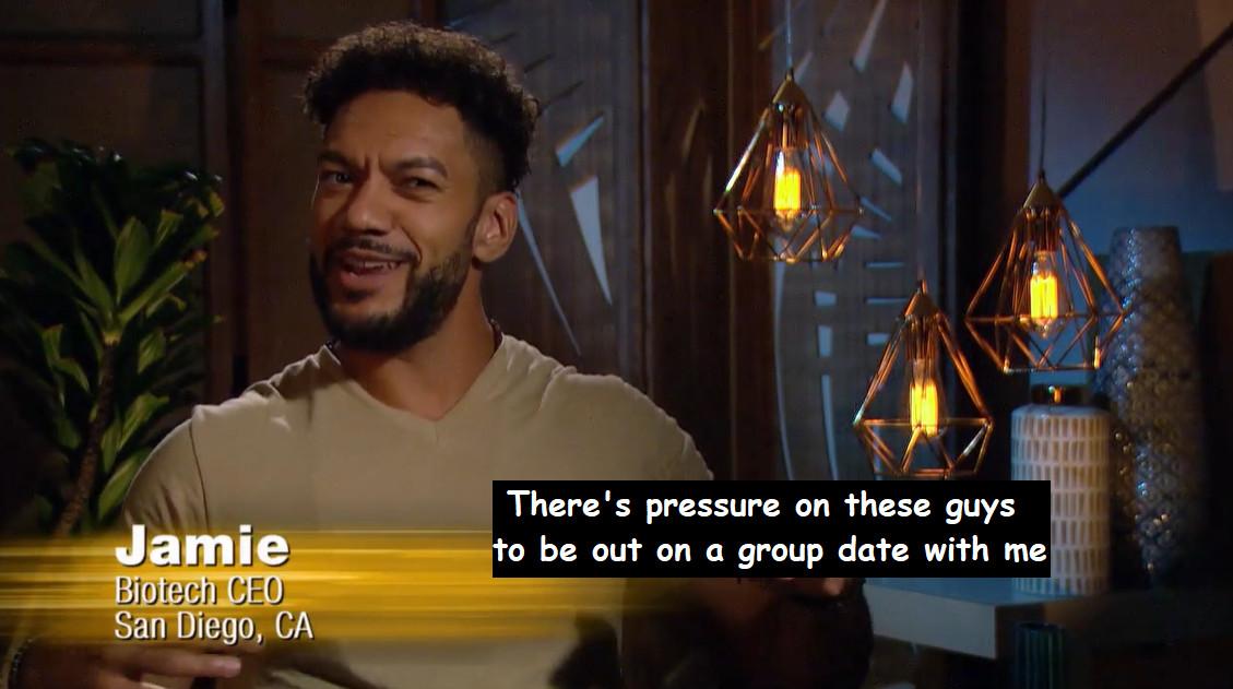 So when Brandon gets the group date rose over him, Jamie, uh, LOSES IT. Like, full ego meltdown—his skin suit can simply no longer cover up the true villain lurking inside. He pulls a producer aside in a room where he clearly doesn’t realize he’s being filmed and whines about having to compete with the likes of Brandon: “You’re telling me that we’re in the same league? Like, we’re not even close.” Jamie tells the producer—whose face we can’t see, but whose eyes I assume are spinning around like a slot machine striking gold—that he thought there would be a stronger group of guys, and that it seems like Michelle is just in “spring break mode,” which is a turn off for him. “Like, I gotta wait for five weeks to get to the end of this?” Jamie snarks.