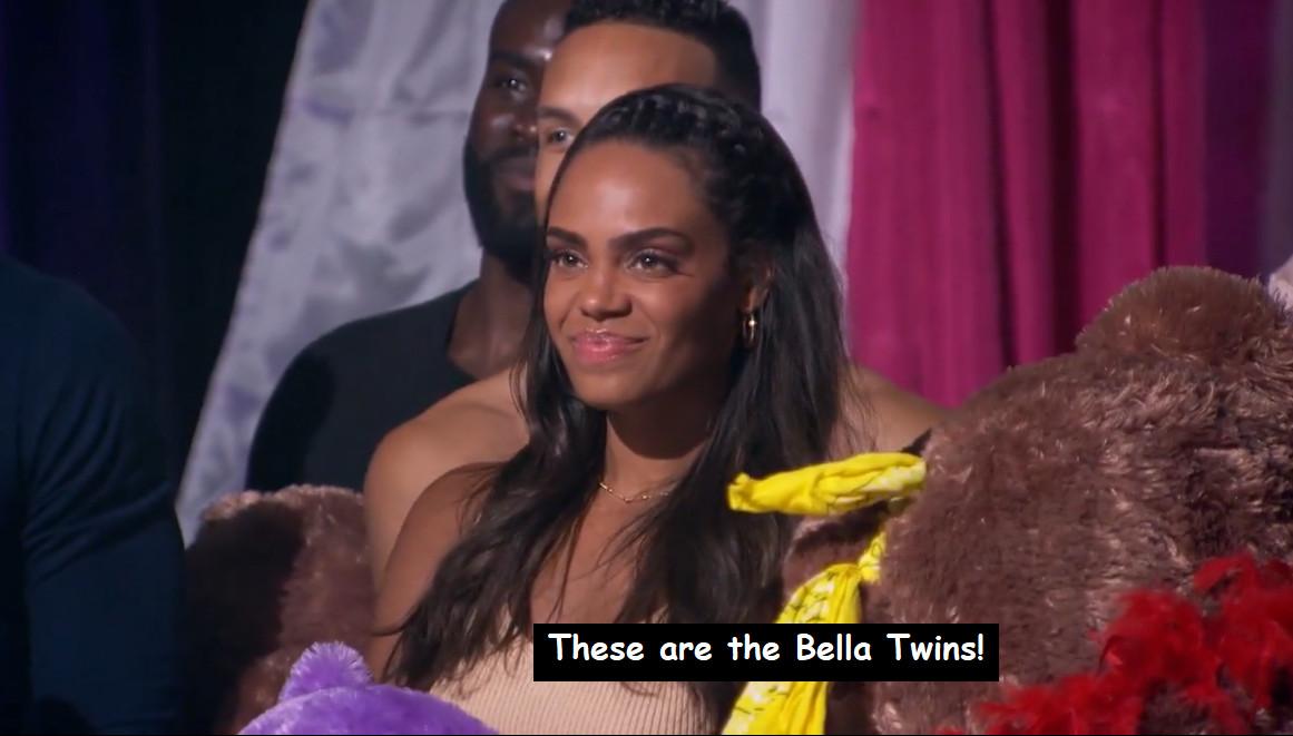 Alas, she cannot. Because when a Bella Twin announces the commencement of an Ultimate Teddy Bear Takedown, the current Bachelorette is honor-bound to attend. So even though Michelle says that she’s even more upset thinking about how she’ll now be even further separated from the men, she’s determined not to make a big deal out of nothing (just her feelings, that’s all!). Michelle says she doesn’t want to “bring down the energy in the room” (just her energy, that’s all!!!), so she sits down with Kaitlyn and Tayshia to watch her boyfriends hit one another with stuffed animals.