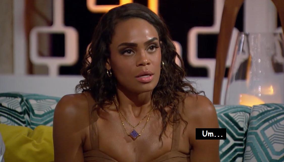 She pulls Nayte to chat first, and tells him that part of what made the day so hard was him not trying to connect with her at all, given the level of feelings she’s already developed for him. And he definitely listens, apologizes, and assures Michelle that he’ll work harder, but ... I was kind of expecting more from Nayte. I assume Michelle pulled him first because she thought he would be the most comforting, but even in this moment, he doesn’t go out of his way to make sure that he shows Michelle he understands why she was so hurt.