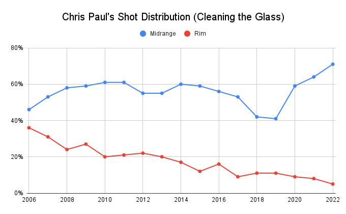 Paul has always lived in the midrange, of course, and he led point guards in midrange rate in each of the past two seasons. His at-rim rate has essentially fallen consistently from the start of his career until now. But the gap has grown to an extreme. (The two-season dip in his midrange rate on this graph represents his Houston tenure.)