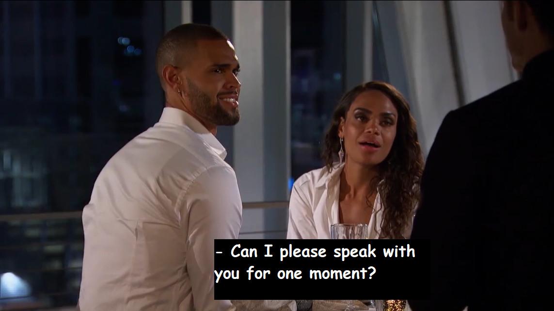 This is when Chris S. shows up, saying that he needs to talk to Michelle because he didn’t get to speak with her on the group date (I’m starting to suspect that interrupting Nayte was his intention all along). Praise the Bachelor gods, Nayte stays in his seat and only snarks out one, “Weird,” because he just can’t help himself.