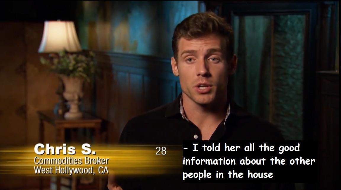 Chris S. is as entitled as they come, and it is torture to listen to him whine and complain about Michelle picking Nayte for this week’s final one-on-one after he explicitly told her not to. And since Chris S. spent last week lying about how Michelle “probed him,” I think it’s time we run a fact check on all of Chris S.’s most offensive lies this week: