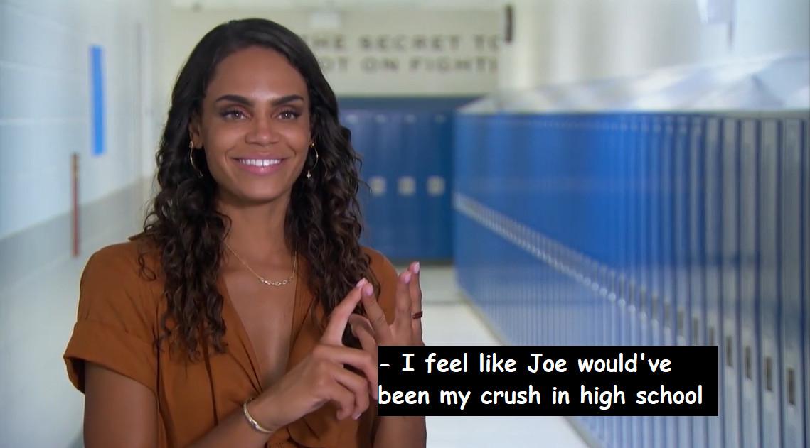 When it comes to speaking multiple sentences out loud and holding sustained eye contact, however, Joe is not quite on Michelle’s level. He may just be the most reserved Bachelorette contestant we’ve ever spent this much time with, and you have to wonder: If Michelle didn’t know who Joe was before he came on her season, could someone this quiet have possibly lasted this long? Personally, I have a suspicion that Michelle has known who Joe was since they almost won Mr. and Ms. Basketball in the same year, and she’s harbored a little crush ever since…