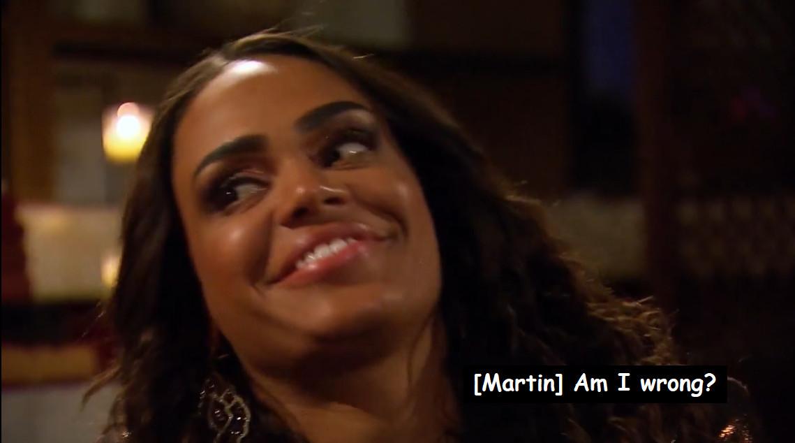 By “this whole situation,” Chris S., of course, means the situation he created out of a conversation that he was not originally involved in. And by “played,” he means that vilifying Nayte didn’t work out the way he thought it would and that’s not fair. Poor Chris S. has been victimized by a situation he made up in his head, and Michelle is gracious about it, but she’s simply not going to take it on. Her likely future husband—or at least temporary fiancé—is waiting just a few feet away. Michelle tells Chris S. that while she believes he had good intentions (one more fact check: He did not), she was caught off-guard by the way he stood up and spoke for her at last week’s cocktail party. She appreciates his attempt to look out for her, but “as a female, and a female of color, there’s a lot of situations where people speak for me, and my voice isn’t heard—I’m empowered when I can speak for myself.”