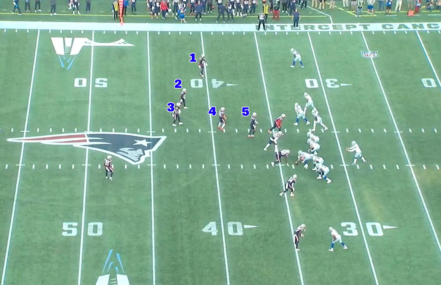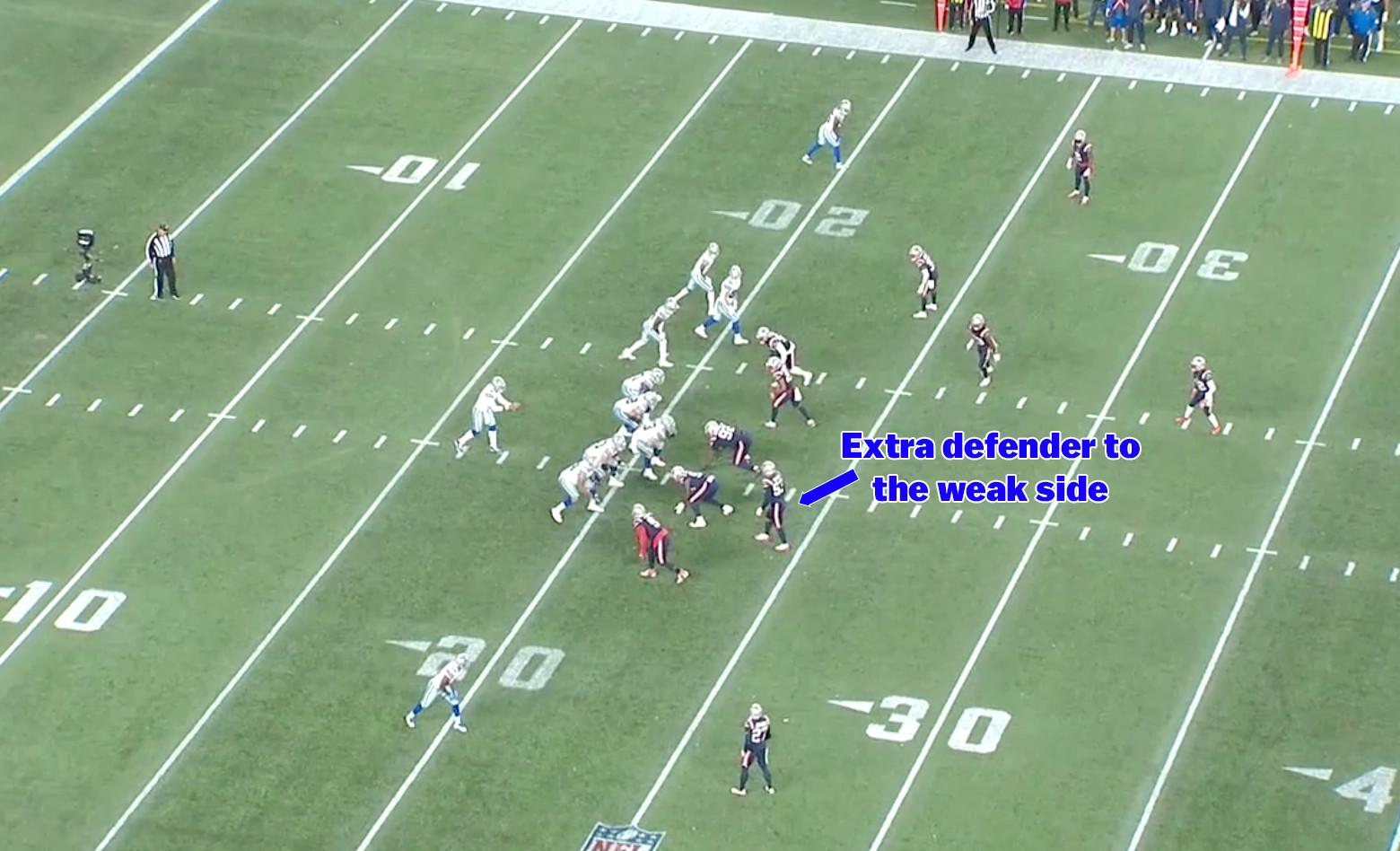 The Cowboys went back to this formation in overtime. The Pats adjusted by leaving a zone defender in the area Wilson had attacked on the first play.