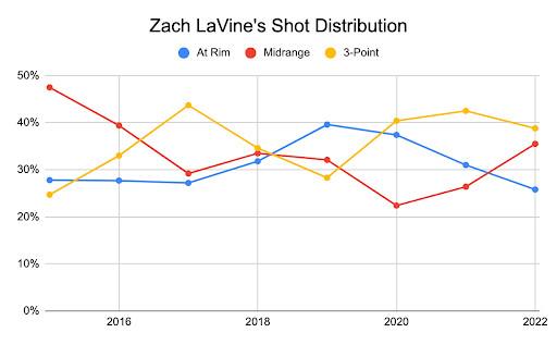 LaVine epitomizes this unfortunate habit, as he has settled for midrange jumpers more than at any point since joining the Bulls. The former two-time dunk champion is taking a career-low percentage of his shots at the rim.