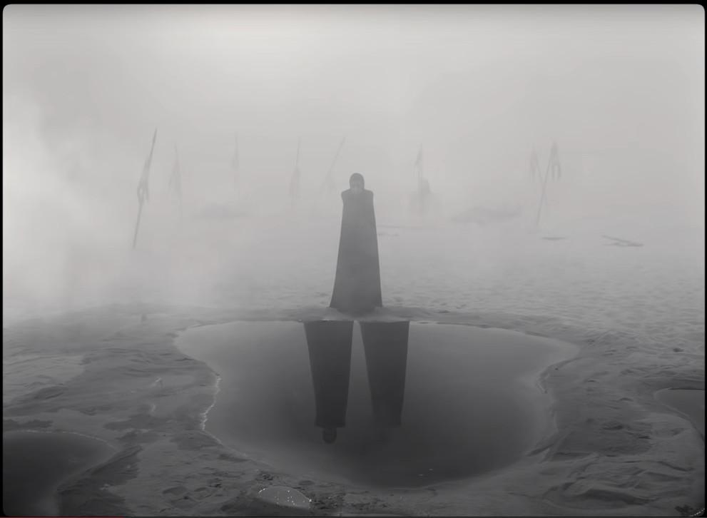 The casting of stage veteran Kathryn Hunter as the Weird Sisters in Joel Coen’s monochrome run-through of Macbeth is the film’s smartest stroke; not only is she at home with the language, but she has the physical dexterity to pull off the three-for-one conceit that finds her talking amongst herselves as well as to Denzel Washington’s title character. But even the most elastic actress can’t be be in three places at once without some help, and Coen and his cinematographer, Bruno Delbonnel, keep coming up with creepy, ingenious visual effects to juice her scenes—none better than this one, with the unholy trinity bridging the elements between land and water. In his recent films with brother Ethan, Coen has been crafting increasingly morbid mages, and in that context, The Tragedy of Macbeth’s funereal vibe feels like a culmination. The film’s beauty is almost entirely death-tinged, with head-on compositions that feel like staring at the abyss, as if waiting to encounter something wicked. Right this way, here it comes …
