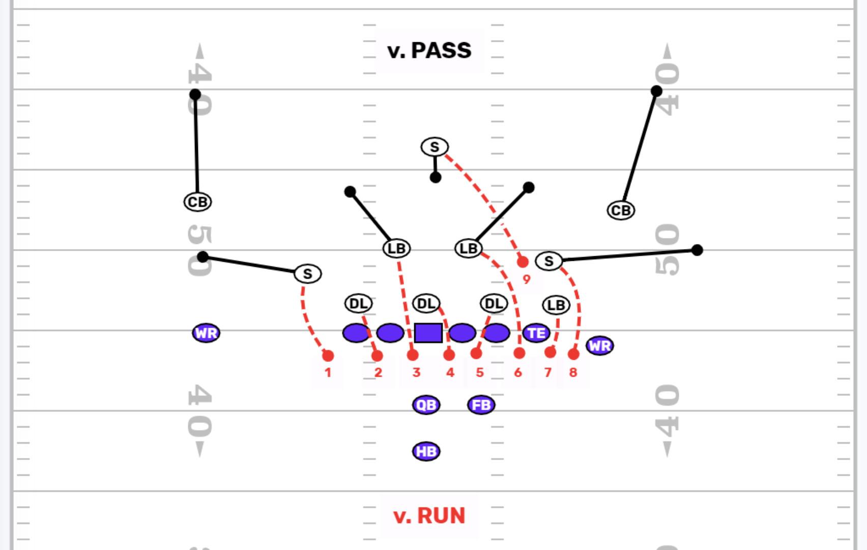 “We wanted to give him loaded boxes all night to get him out of the run game. We were either playing with a loaded box and man-to-man and make him beat us throwing the ball outside mano-a-mano, or we were going to play a zone defense. … So we had eight-, nine-man boxes all night. You play Madden and run Engage Eight all day, it’s hard to run the ball.”