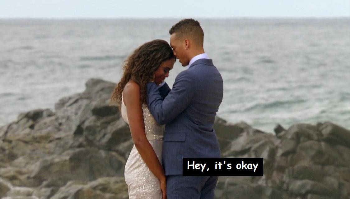 At one point during this finale, Michelle literally asks Nayte if he thinks he’ll “have the words” for an engagement. As in, after choking so hard on expressing his feelings during a low-stakes, spiritually ambiguous bonding ritual that even Hannah Brown was like, “Oof, dude, maybe cruise through a Toastmasters course at the YMCA or something,” Michelle wondered not just if Nayte was ready to get engaged, but if he would technically be able to string enough sentiments together to reasonably ask for her hand in marriage.