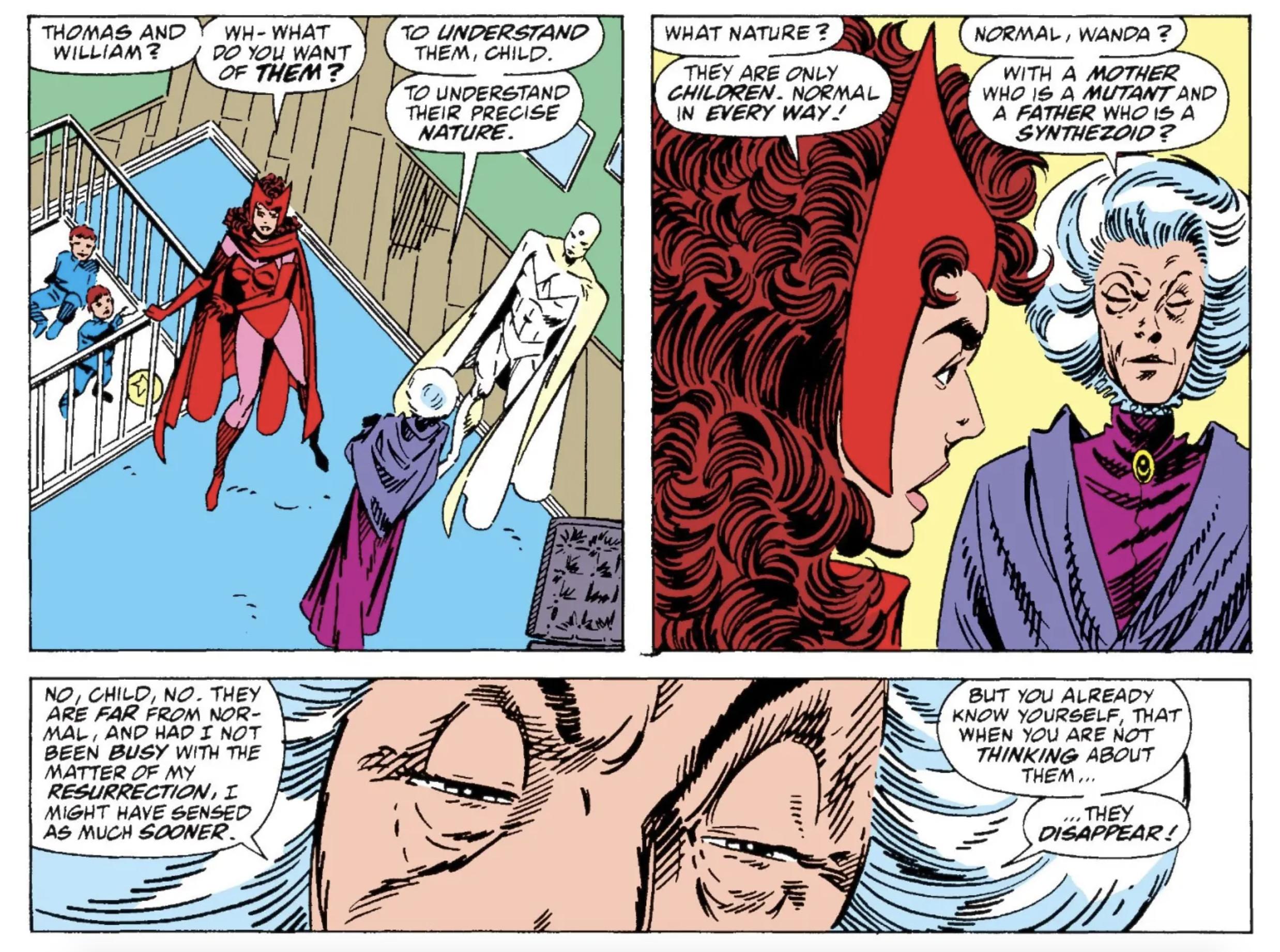 In West Coast Avengers, Agatha Harkness—a witch and Wanda’s mentor—returns from the dead and casually shows up at Wanda and Vision’s house. (In case you didn’t know, nobody really stays dead in the comics. Except for, like, Uncle Ben.) Agatha confronts the unsuspecting parents with the fact that the moment Wanda loses sight of her children and stops thinking of them, they simply cease to exist.
