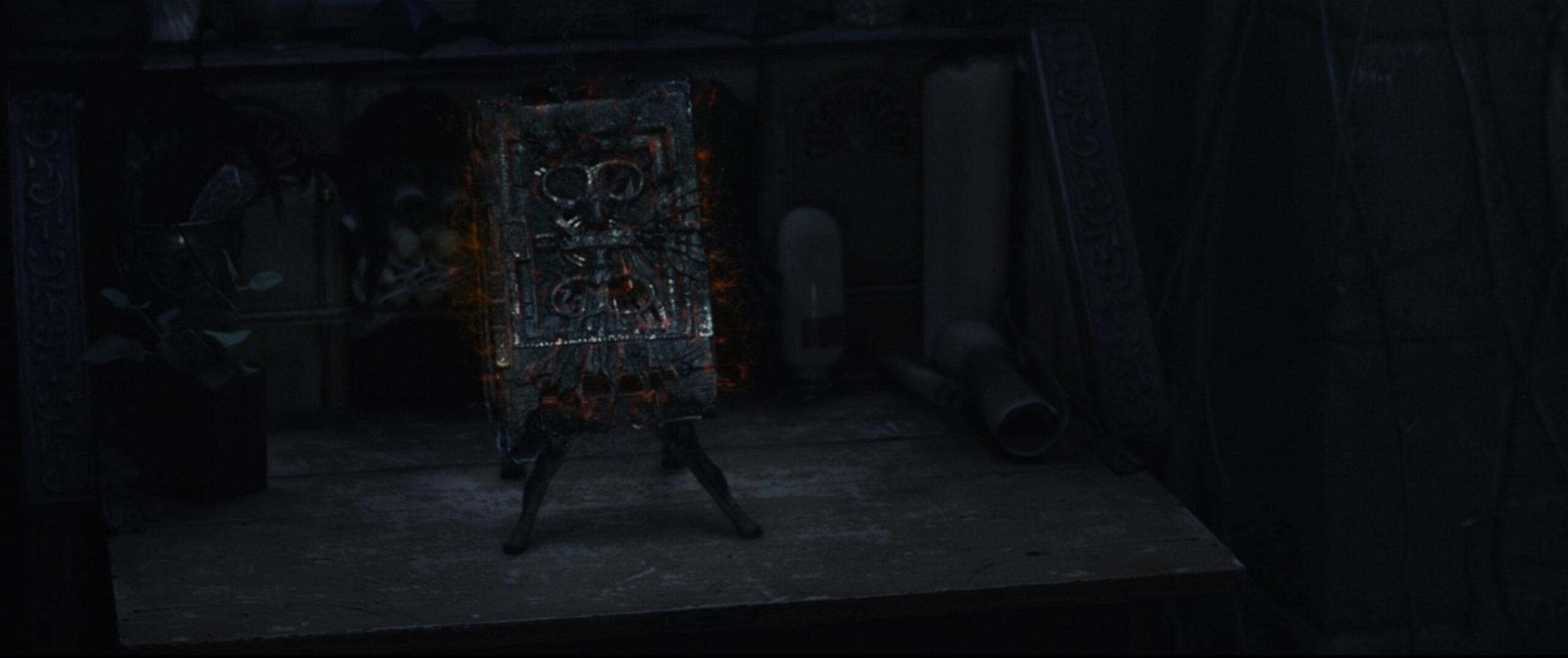 When Wanda walked down the stairs of Agatha’s house in search of the missing twins at the end of the seventh episode, the aspect ratio of the screen adjusted to indicate that we were leaving Westview, placing the basement outside of Wanda’s hex. And while Wanda may be the Scarlet Witch, she hasn’t spoken much about magic or witchcraft in previous films—after all, in the MCU her abilities were created through HYDRA’s experimentation with the power of an Infinity Stone. This book, on the other hand, looks like the kind of witchy stuff you could find in a Grimm fairy tale: