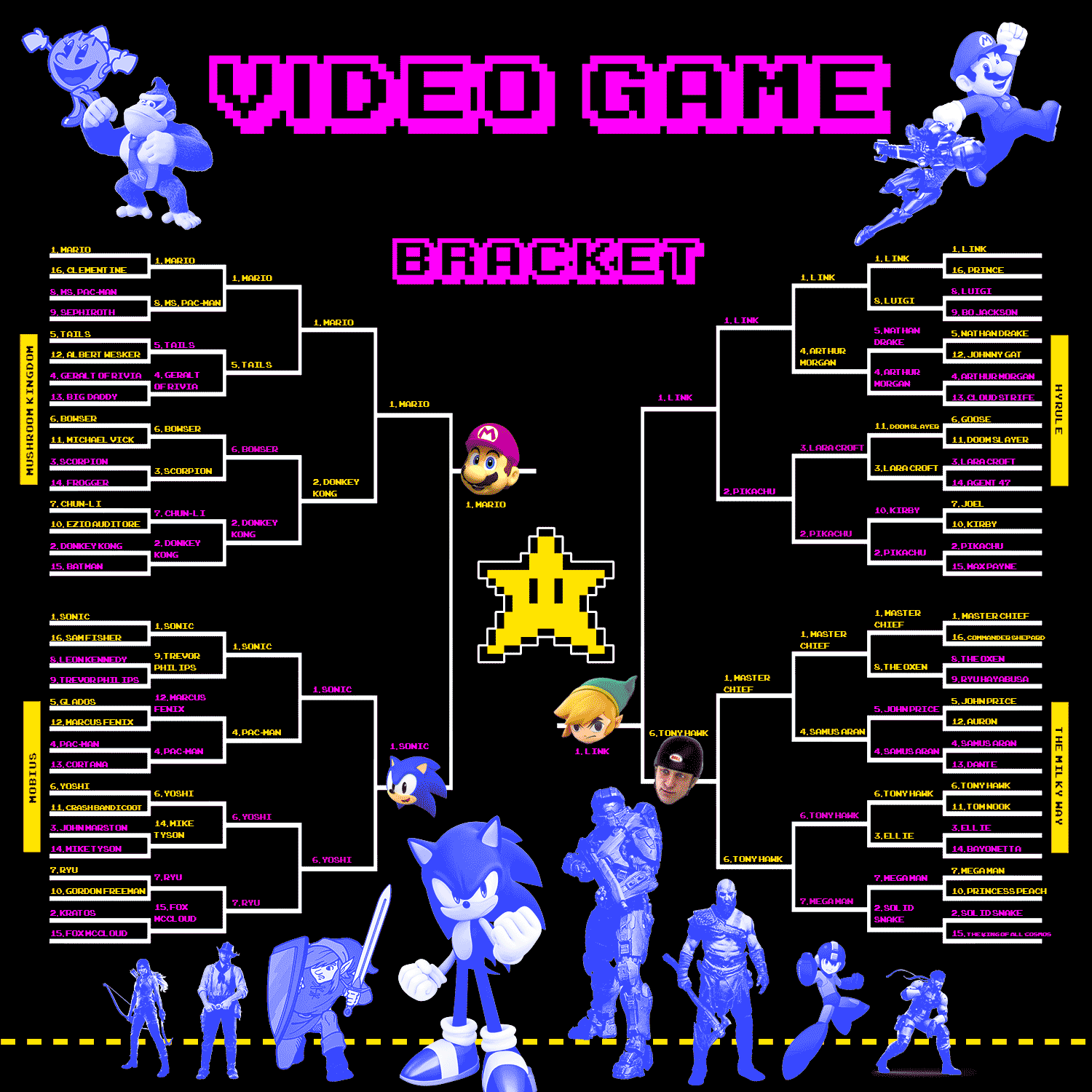 The Final Four of The Ringer’s Best Video Game Character Bracket featured four icons of the medium: Mario, Sonic, Link, and Tony Hawk. (OK, sure, it’s totally fair to say that the last guy in that list maybe doesn’t belong in the same echelon as the first three, but that doesn’t mean he’s not an icon. He’s also a real human, which is maybe notable here.) The four competitors had made light work of their previous opponents, suggesting that they clearly stood above all the rest, and hinting that the Final Four would be an all-out war. But that’s not what happened. Instead, two characters proved that they’re in an even more elite class, all to themselves.