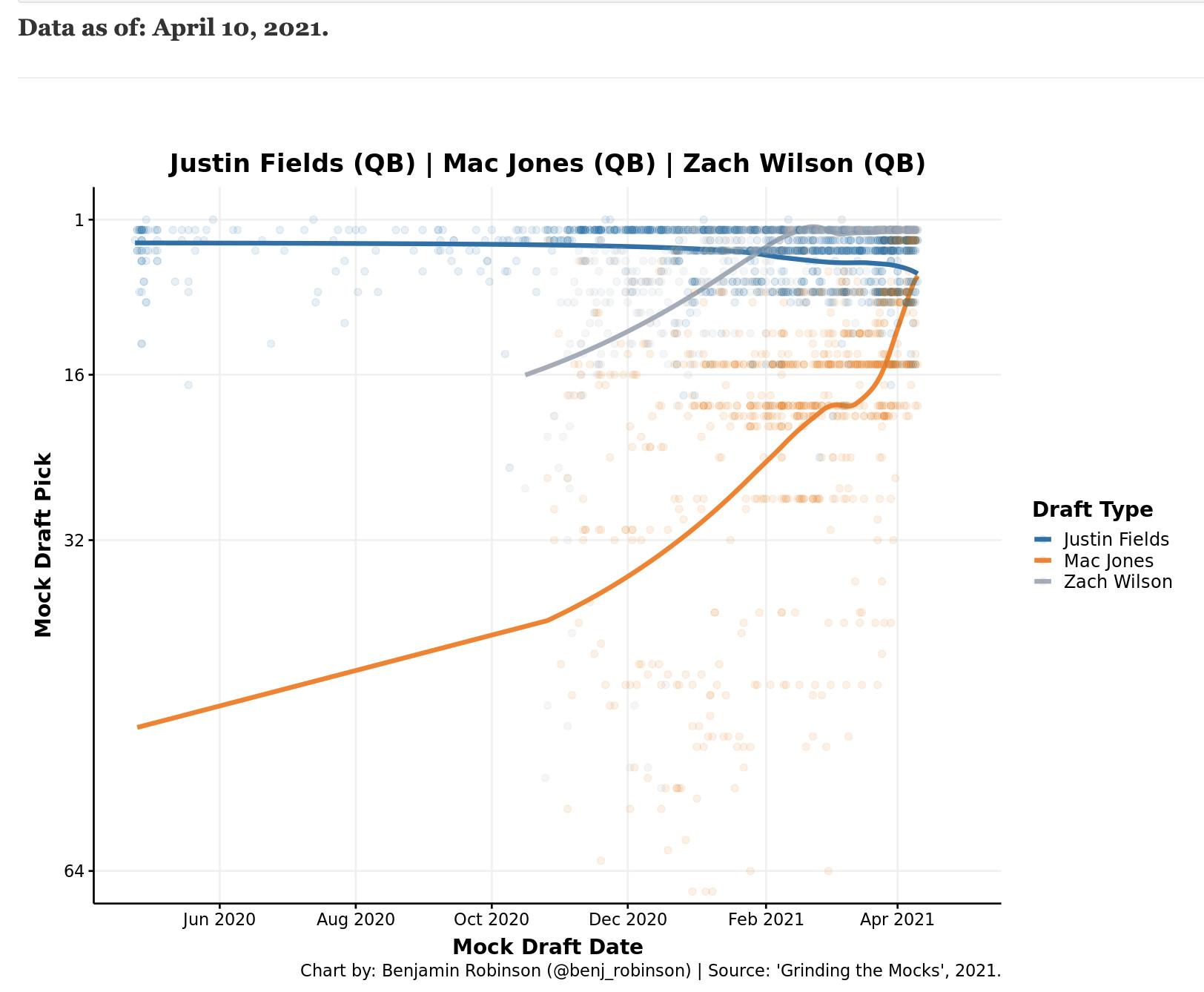 Of course, player assessments go beyond statistics. Back in February, Pro Football Network’s Tony Pauline mentioned that an NFL team representative he spoke with at the Senior Bowl asserted that Fields moved to his second read—meaning he targeted a player who wasn’t the primary receiver on a play—seven times out of 225 attempts. This narrative coincided with the beginning of a drop in his perception. Take a look at the below graph from Benjamin Robinson’s Grinding the Mocks site, which has tracked more than 1,000 different mock drafts, to see how Fields’s standing has changed in comparison to Wilson and Jones: