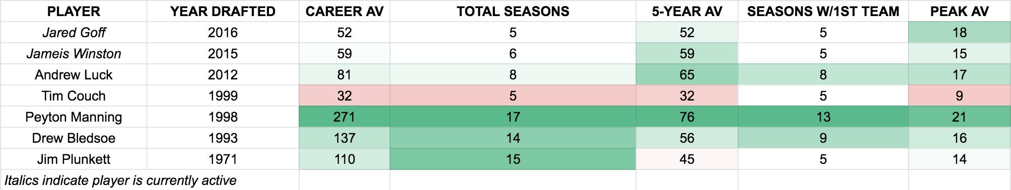 Let’s follow my colleague Rodger Sherman’s method in breaking down how often the first QB selected in an NFL draft ended up being the best player in his class, based on Pro-Football-Reference’s career approximate value statistic (AV). As Rodger noted, AV isn’t a perfect metric to evaluate a QB’s career, but it does give us a quantifiable way to compare each passer’s career across different eras. The stat does benefit players who had longer careers, but, uh, most good QBs you’ll see on this list—including Andrew Luck, who retired early—ended up having lengthier careers than the average passer. With that in mind, in the following graphics, I’ve included a column indicating the AV of each passer through their first five NFL seasons (the length of a first-rounder’s rookie contract, when options are used), along with a column indicating how many seasons they spent with the team that originally drafted them. The last column shows a QB’s best individual season based on AV.