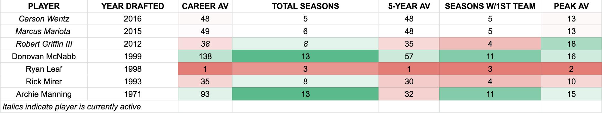 Green represents players who were above average; red is below. You’ll notice more red in the second image, meaning that NFL teams, in a vacuum, have done a much better job of maximizing the no. 1 pick. Only once has the second QB recorded a higher career AV than the first (Donovan McNabb topping Tim Couch). Short-term success significantly favors no. 1 picks, who record an average of 55 AV over their first five seasons, compared to 36 AV for no. 2 picks.