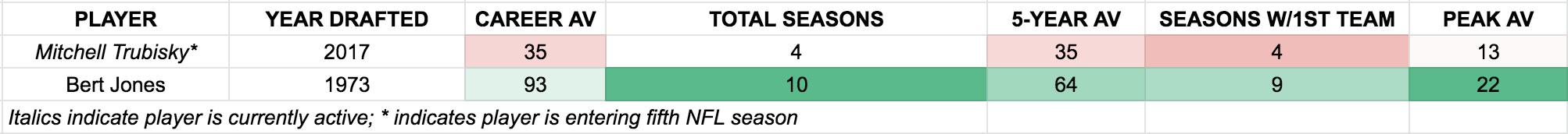 What about a quarterback picked at no. 2 when the no. 1 pick wasn’t used on a QB? That scenario has happened only twice in the post-merger era: Mitchell Trubisky in 2017 and Bert Jones in 1973. In the context of AV, their careers have been dramatically different, perhaps affirming the idea that the draft is an absolute crapshoot:
