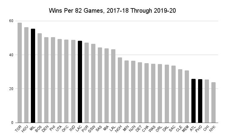 Nobody would have believed it if you’d told them, a year ago, that Atlanta and Phoenix were on the brink of the Finals. That’s because both teams had been absolutely abysmal in recent seasons. In the past three seasons before this one, the Hawks and Suns ranked 27th and 28th, respectively, in winning percentage. The Bucks and Clippers, their conference finals competition, ranked third and 10th, with winning records every year.