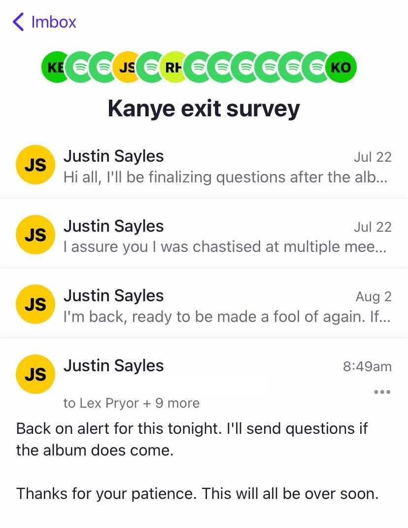Baker: Look, I don’t want anyone to be saddled with unnecessary stress during these difficult times, but on the other hand, the torture Kanye put The Ringer’s dear sweet music editor Justin Sayles through was, to me, a delight.