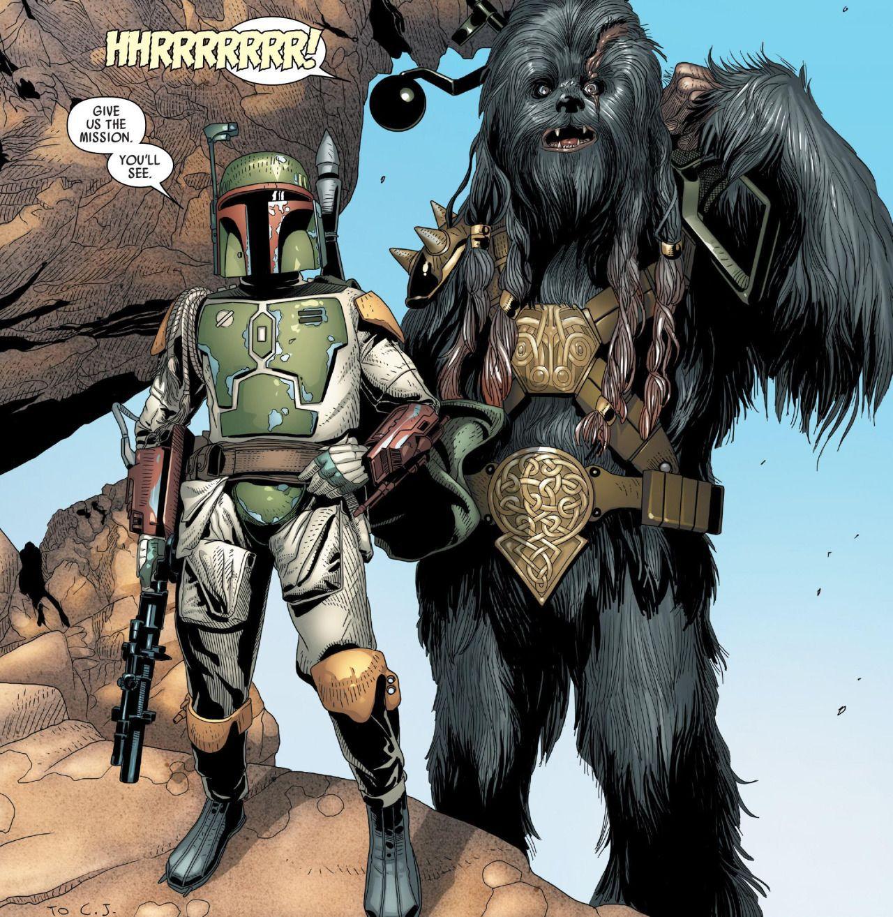 Fett and Black Krrsantan have a history. Both worked for Jabba, and when Darth Vader traveled to Tatooine after the Battle of Yavin to negotiate with the Hutt for supplies, he requested the Hutt’s two best bounty hunters for his personal use. Jabba offered him Fett and Black Krrsantan. While the former looked for Luke, the latter was tasked with tracking down an agent of the Emperor. After completing that mission, Black Krrsantan worked with another fan-favorite comics character, the criminal archaeologist Doctor Aphra, who was introduced during the Darth Vader run and later starred in her own Marvel comics series. Eventually Vader hires Black Krrsantan to find Doctor Aphra, but after initially turning her over to the Dark Lord, he decides to save her life. (Which means that in theory, she could cross over next.)