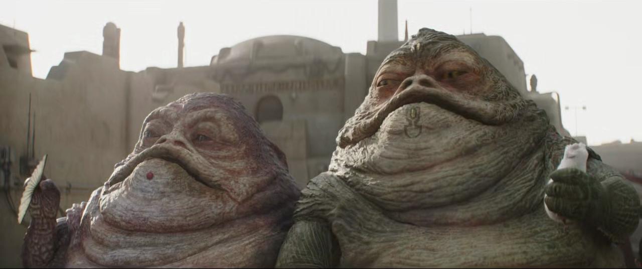 Shortly after Fett and his retinue arrive at the Sanctuary, a distant drum sound silences Max Rebo’s band and draws the daimyo outside. (The episode’s subtitles refer to Rebo’s sound as “fusion music,” so maybe Max has moved on from traditional Jizz and recorded his Bitches Brew.) There he meets two challengers to his throne: a pair of Hutts known as “the twins,” a brother-sister combo of cousins to Jabba. (Although Legends had it that Hutts could switch sexes at will, Hutts in current canon have a single sex.) These Hutts, who look almost as massive as Tatoo I and II, are traveling on a double-wide litter supported by servants, the customary mode of transportation for Tatooine crime lords before Fett. A hoversled would do the job just as well, but the litter isn’t just a means of traveling in comfort; it’s a way to project power and flaunt forced subjugation as a warning to anyone who would defy the Hutt’s crime cartel. These unidentified Hutts could’ve been carbon copies of Jabba, but everything about them—from their intertwined bodies to their speaking styles to their differing methods of keeping cool and dry—is laden with extremely specific and eye-catching details that set them apart.
