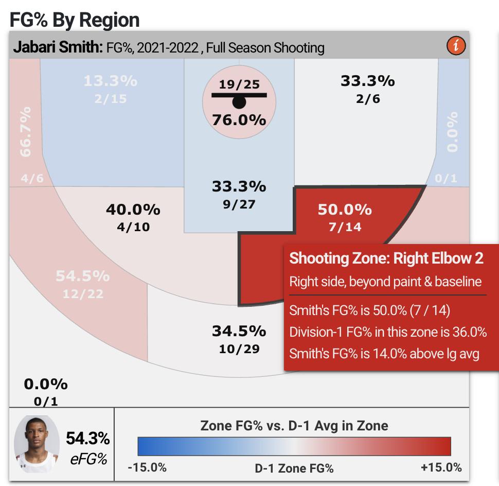 As a finisher, some of this will be alleviated by adding strength. Smith might not rise up and over people for aggressive rack-attack finishes, but it’ll help him avoid getting nudged off his path and thwarted by smaller or lesser athletes. There’s also the question of midair ball control, which allows players to readjust and take fully extended, elusive angles. But over the course of his freshman season he’s shown some ability to take contact and still finish with touch.