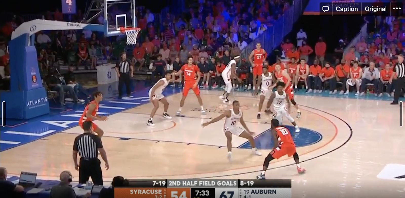 The flashes of expansive playmaking craft haven’t been abundant, so we’re looking for the indicators. He’s typically passing within the flow of the offense: hitting Walker Kessler, Auburn’s gigantic shot-blocking center, with entry passes over the top or simply making the simple pass at the correct time. Past that, it’s hard to nitpick placement, velocity, angle, and technique because we’re just not seeing a ton of it. We’re not seeing much in the way of single-handed skips (he’s a very two-hand-dominant passer in general) or instances when he draws an additional defender and finds an open teammate. Kessler bobbles the pass here, but this absolutely should be an assist for Smith: