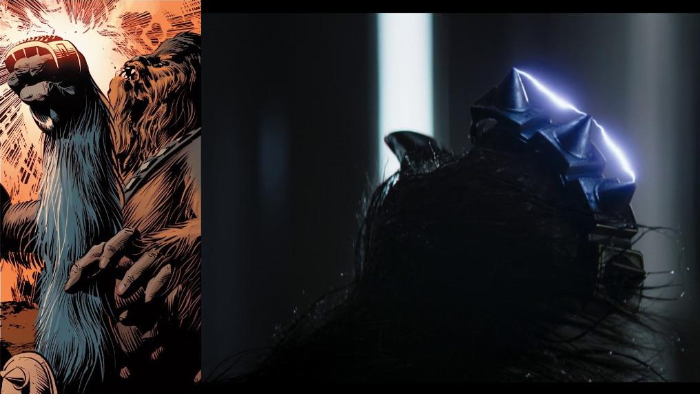 If Boba broke down as the bonfire burned, we may never know, because his bacta reverie is rudely interrupted by Black Krrsantan, who yanks him back to the present by prying open his tank and hauling him out. (“Sleep lightly,” indeed.) The bounty hunter is hardly unobtrusive, so palace security seems a little lax; Fett’s already weathered one assassination attempt, so you’d think someone would be on watch while he’s getting his beauty time in the tube. In the comics, Obi-Wan and Bossk individually best BK (or at least duel him to a draw), but an unarmed, unarmored, and abruptly awakened post-sarlacc Fett is no match for the massive Wookiee, whose significance to the franchise I explained in last week’s recap and Ringer-Verse deep dive. BK beats Boba with an electrified version of the brass knuckles he once used to knock out Chewbacca, then holds him aloft, bites his hand, and delivers a loud spinal adjustment.