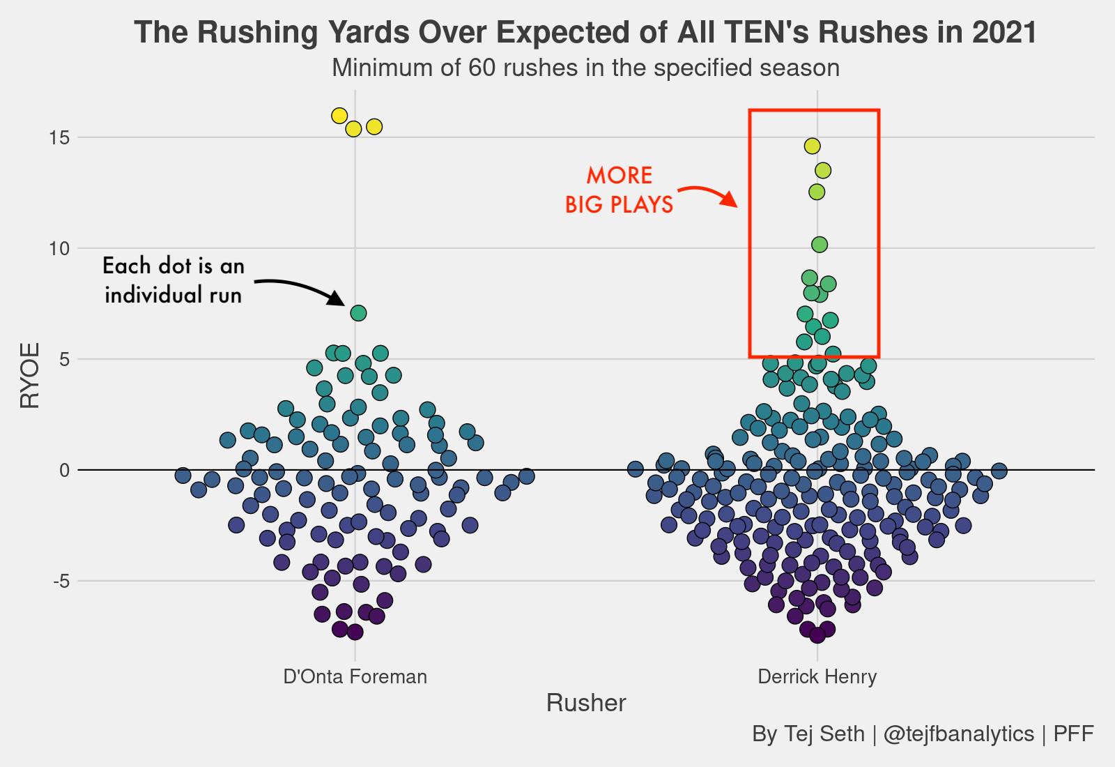 Not to mention the fact that much of Foreman’s performance can be chalked up to getting better blocking and play-calling compared to what Henry had to work with. Based on Pro Football Focus’s rush yards over expected metric, Henry has been the far better runner relative to factors outside his control.