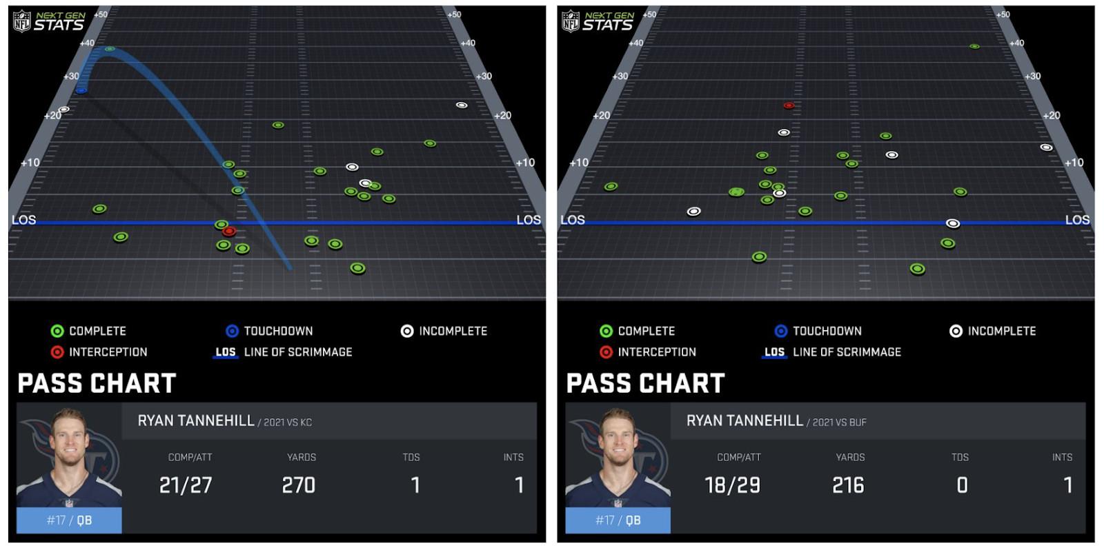 When the Titans offense gets rolling, Henry is able to rip off big runs, and Tannehill throws in-breaking routes to Brown and Jones. That was the formula for Tennessee’s best offensive stretch of the season, which included those wins over the Bills and Chiefs. Just look at Tannehill’s passing map in those two games, via Next Gen Stats: