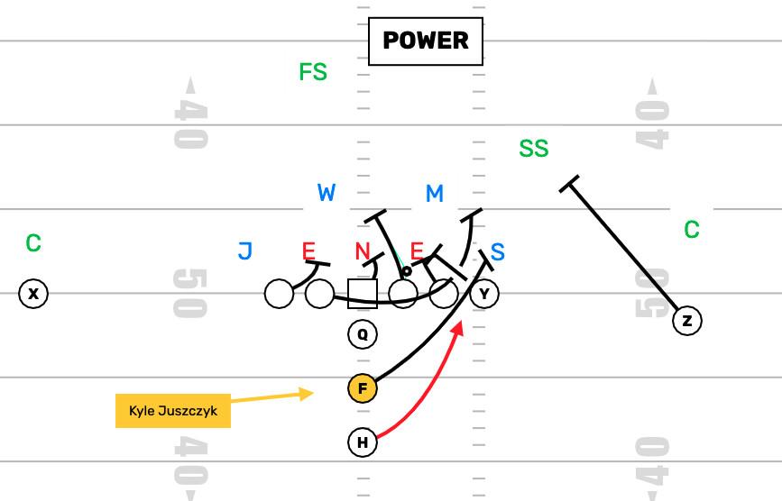 Duo is often described as “power without a puller,” and that’s because of the thick double-team at the point of attack. The Rams had to run “power without a puller” as an answer to the zone-denying fronts they were seeing because, well, they didn’t really have a puller available. The 49ers had no such problems—they had Juszczyk rostered, and George Kittle, a knockout blocking tight end. During the 2019 season, the 49ers could just run straight power, and the many other iterations of “man blocking schemes”—schemes that, unlike zone blocking schemes, are designed to hit one gap by coordinating double-teams, climbs, and kickouts all across the offensive line.