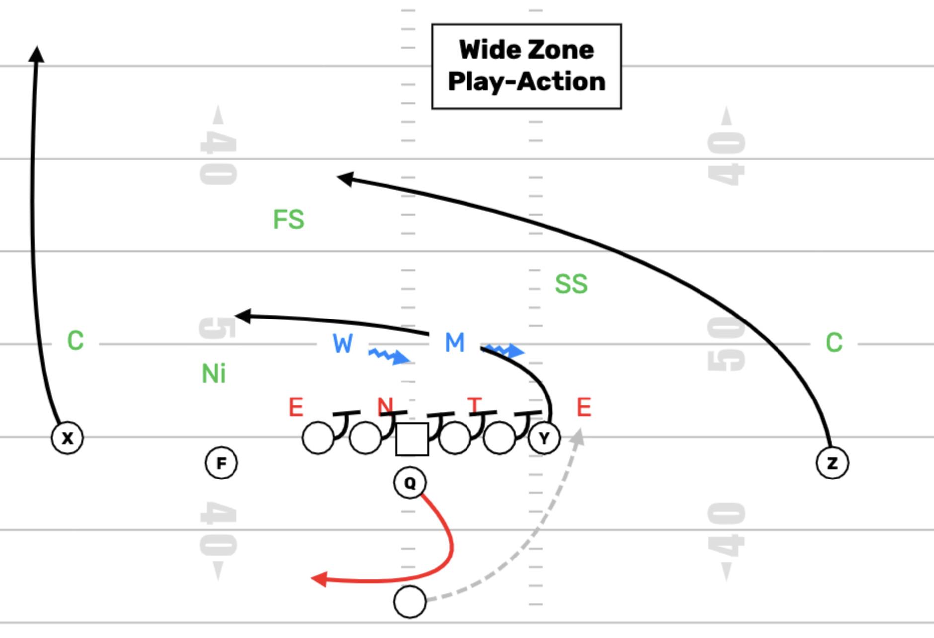 It is important to define what exactly Shanahan and McVay shared when they took their respective jobs. At the core of their offenses is the wide zone running play. Wide zone refers to the blocking of the offensive line, as well as the path of the running back. On a wide zone run, each offensive lineman steps in the same direction and explodes horizontally, looking to get to the play side of each opposing defensive lineman and linebacker. This forces a strong flow from the defense: Defensive linebackers and linemen must race to beat offensive linemen to their marks. As the defense flows, the running back is able to pick the best running lane and cut upfield to punish the defense for flowing too aggressively with the offensive line.