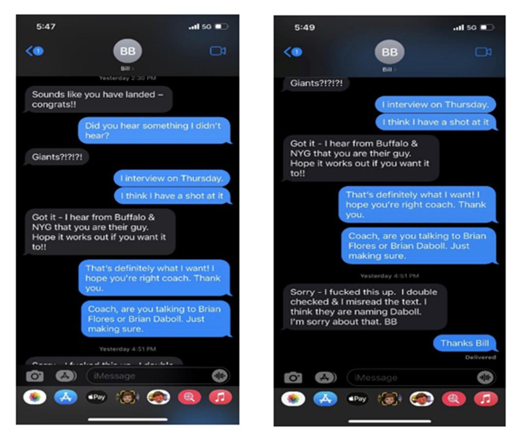 The lawsuit includes a text thread between Flores and Patriots head coach Bill Belichick that shows how the Giants had selected Bills offensive coordinator Brian Daboll as their new head coach before Flores’s interview. Three days before Flores’s interview with New York, Belichick texted Flores: “I hear from Buffalo & NYG that you are their guy.” Flores asked whether Belichick had meant to text Daboll, to which Belichick replied: “Sorry - I fucked this up. … I think they are naming Daboll.”
