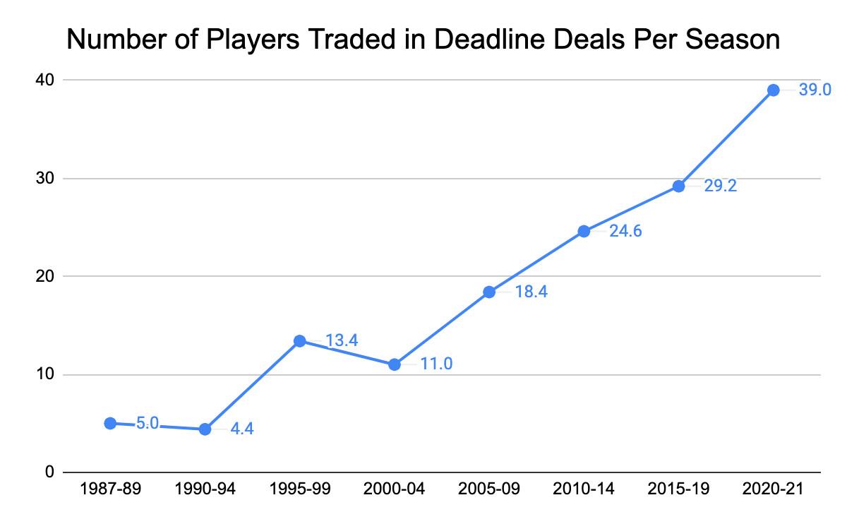 Looking specifically at deadline deals, via an analysis of NBA.com data, 58 percent more players have been traded at each deadline in the 2020s than in the early 2010s, and 112 percent more than in the late 2000s.
